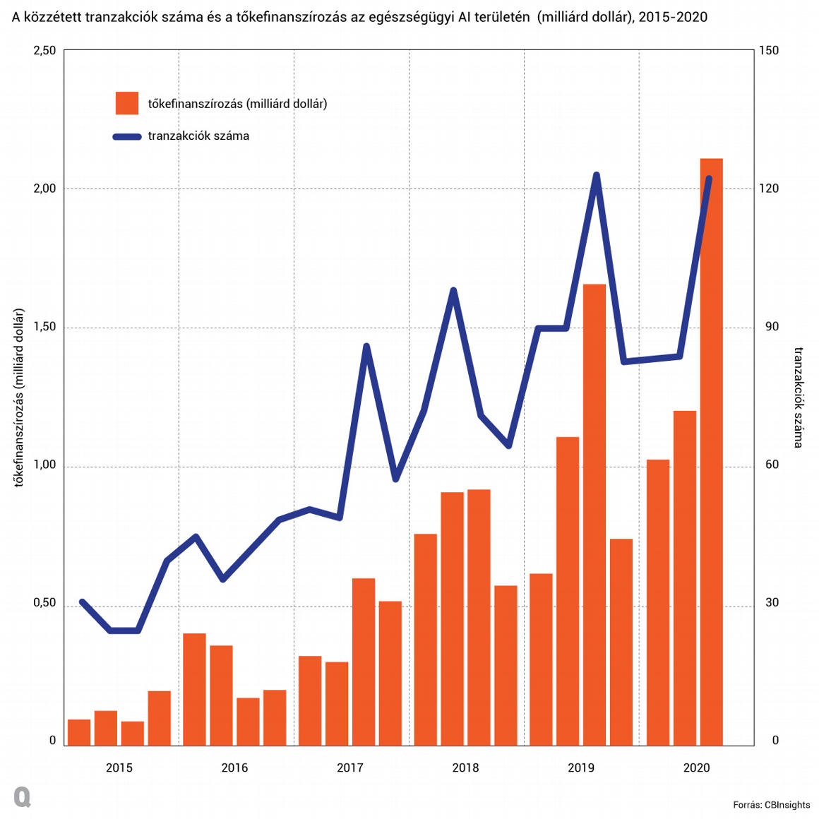 A CB Insights üzleti elemző platform információi szerint az MI-alapú egészségügyi megoldásfejlesztőkbe az elmúlt 5 év trendjét folytatva 2020-ban ismét rekordösszegben érkeztek kockázatitőke-pénzek: a szektor 4,5 milliárd dollárnyi befektetésnél járt 2020 szeptemberének végén. A koronavírus-járvány nem lassította, hanem inkább tovább gyorsította a folyamatokat. Számos 100 millió dollárt meghaladó összegű befektetésre is sor került, elsősorban a gyógyszerfejlesztést célzó MI-megoldások területén.